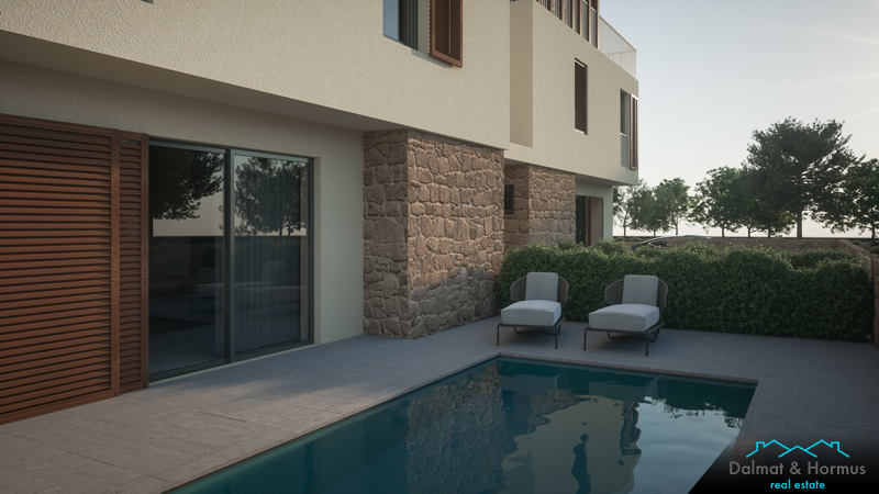 TRIBUNJ - DUPLEX VILLA WITH SWIMMING POOL, ROOF TERRACE WITH JACUZZI AND SEA VIEW! It is located in an attractive location near all necessary facilities. It has a modern architecture with an emphasis on high-quality and durable materials, and interior is spacious and full of light. It has a yard with a garden and a swimming pool. It consists of a ground floor, first floor and second floor, total area of 142,09 m2. On the ground floor there is a living room, kitchen, dining room, 2 storage rooms, hall, terraces of 29,34 m2 and 13,57 m2, yard of 6,78 m2, garden of 44,19 m2 and parking space. On the first floor there are 3 bedrooms, bathroom and hallway. On the roof terrace of 41,73 m2 there is a Jacuzzi.