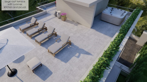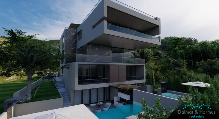 Materials and equipment: solid concrete, reinforced concrete slabs, Baumit facade with 15 cm HI styrofoam, Schuco windows and doors Ase 80 Hi, aluminum shutters on the balconies, natural Brač stone on the facade and walls, Italian porcelain with a mirror effect (detail on the facade), video surveillance of parking with automatic sliding doors, automatic outdoor lighting/LED lighting, Mediterranean gardens (palms, oleander, pitospora, lavender), semmelrock stein + project for parking and direct access to the sea, Rubinetti Paffoni for bathrooms, Italian porcelain for Memento walls and floors, the entire apartment has underfloor heating and is air-conditioned (heating, cooling), energy class A, private pools and gardens, outdoor showers, summer kitchens, Jacuzzi.