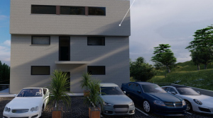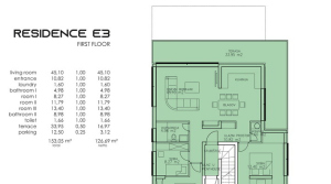 E3 - first floor - 126,69 m2. It consists of an entrance hall, a living room, a kitchen, a dining room, 3 bedrooms, a laundry room, a toilet, a terrace of 33.95 m2 and a parking space.
