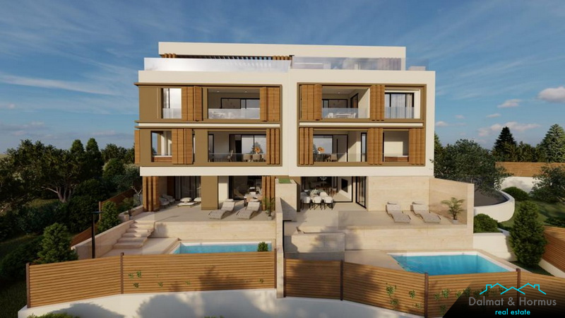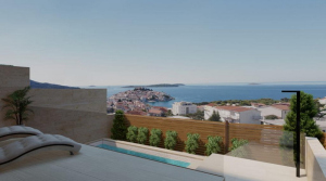 The pearl of the Adriatic Sea, Primošten will become richer for an extremely attractive property that will be located on a gentle hill with a view of the sea and islands. They are situated near the beach and all necessary facilities. Top quality will be visible in the choice of construction materials as well as in the built-in equipment, which includes underground garages and elevators. The apartments on the ground floor have outdoor pools on the terrace, apartments on the first floor have hydro-massage tubs on the terraces, and the penthouse has a Jacuzzi, sauna and a private garage for two cars. There are 7 apartments in the building. Each apartment has a beautiful view of the sea, burglar-proof entrance doors, high-quality aluminium carpentry with electric blinds, underfloor heating with a heat pump, suspended ceilings with built-in air conditioners, glass fences on the terraces, barbecue, garage and outdoor parking space and storage in the basement of the building. The entire building has video surveillance. Proximity to the sea is 400 m.
