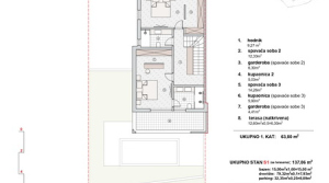 The first floor - 63,80 m2 - consists of a hallway, 2 bedrooms, 2 wardrobes, 2 bathrooms and a covered terrace of 12,60 m2.