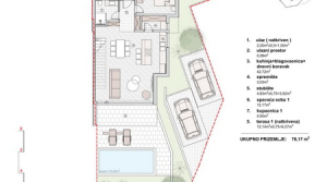 Ground floor - 78,17 m2 - consists of a covered entrance, kitchen, dining room, living room, storage room, bedroom, bathroom and a covered terrace of 12,14 m2.