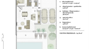Ground floor - 79,78 m2 - consists of a covered entrance, entrance space with wardrobe, kitchen, dining room, living room, bedroom, bathroom and a covered terrace of 12,04 m2.