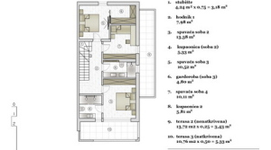 First floor - 69,87 m2 - consists of a hallway, 3 bedrooms, wardrobe, 2 bathrooms, covered terrace of 10,76 m2 and uncovered terrace of 13,72 m2.