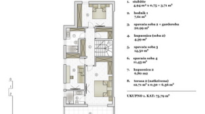 First floor - 75,79 m2 - consists of a hallway, 3 bedrooms, wardrobe, 2 bathrooms and covered terrace of 12,71 m2.