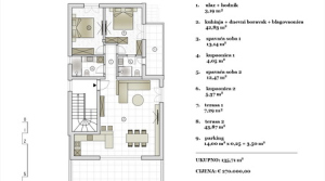 S3 - prvi kat - 135,71 m2. Sastoji se od ulaza, hodnika, kuhinje, blagovaonice, dnevnog boravka, 2 spavaće sobe, 2 kupaonice, 2 terase od 7,29 m2 i 43,87 m2 i parkirnog mjesta.